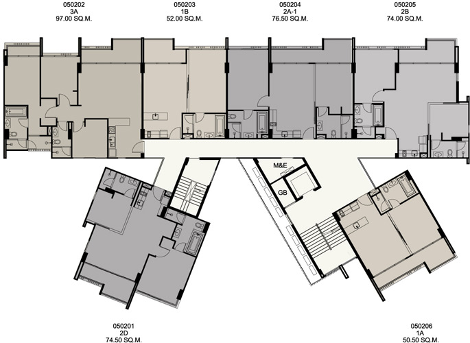 | ลักษณะห้องและขนาดห้อง | – 1 Bed / 50.50 – 52.00 ตร.ม. – 2 Bed / 74.00 – 97.00 ตร.ม. – 3 Bed / 97.0 ตร.ม. |