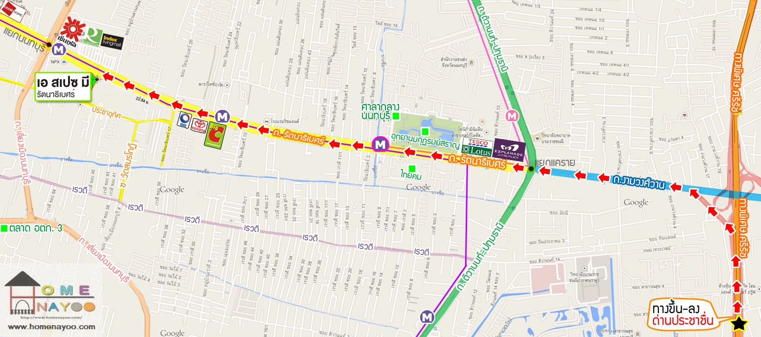 การเดินทาง ( ทางพิเศษศรีรัช (ด่านหัวลำโพง) > แจ้งวัฒนะ > งามวงศ์วาน > ทางพิเศษศรีรัช (ด่านประชาชื่น) > งามวงศ์วาน แคราย-สาธารณสุข > งามวงศ์วาน-แคราย > ถนนงามวงศ์วาน > แยกแคราย > ถนนรัตนาธิเบศร์ > A Space Me รัตนาธิเบศร์ )