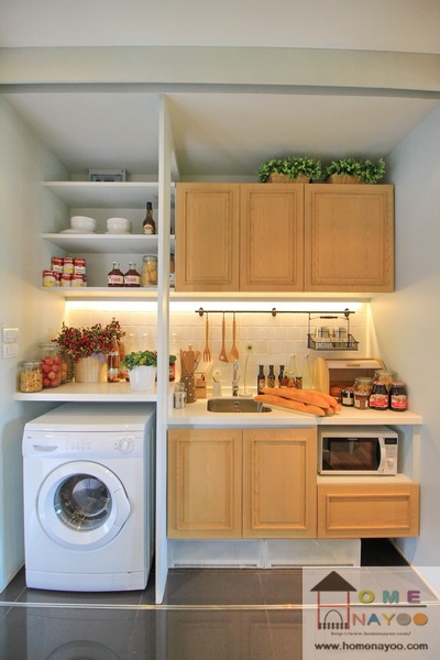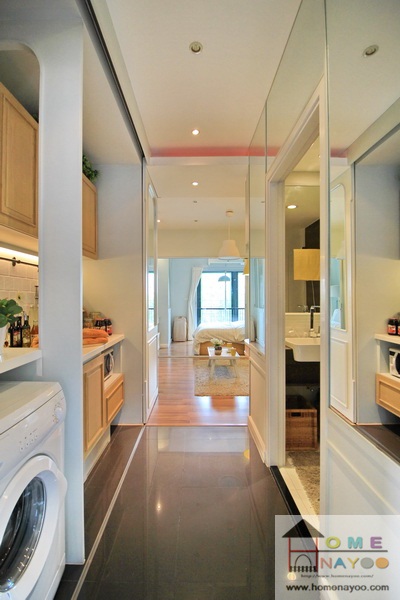 ติดกับเคาน์เตอร์ครัว ห้องจริงจะเป็นพื้นที่เปล่า เว้นไว้สำหรับวางเครื่องซักผ้า จะบิวท์อินชั้นสำหรับวางของแบบโครงการก็ดีค่ะ เพิ่มพื้นที่ใช้สอยได้มากขึ้นอีกด้วยค่ะ
