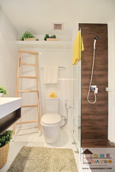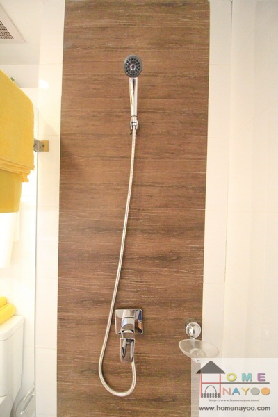 ฝักบัว Hand Shower ก็อกน้ำก้านโยก ติดที่วางสบู่ให้เรียบร้อย มีการตกแต่งผนังส่วนอาบน้ำด้วยกระเบื้องลายไม้เข้าไปด้วยค่ะ