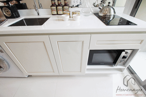 ด้านล่างจะมีตู้เก็บของใต้ซิงค์ล้างจานพร้อมถังขยะ ติดกันเป็นตู้เก็บของ ภายในแบ่งเป็นช่องเก็บของ 2 ช่อง และได้ลิ้นชักสำหรับเก็บช้อนส้อม 1 ลิ้นชัก ด้านล่างเป็นช่องสำหรับวางเตาไมโครเวฟซึ่งของจริงเราจะไม่ได้พวกเครื่องใช้ไฟฟ้ามานะคะ