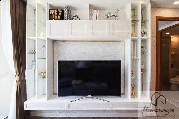 ฝั่งตรงข้ามโซฟาจะเป็นชั้นวางทีวีแบบบิ้วอิน มีช่องเก็บของให้มาหลายช่องเลยค่ะ ซึ่งช่องต่างๆนี้ดูเหมาะจะเป็นช่องสำหรับใส่ของโชว์นะคะ
