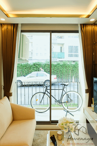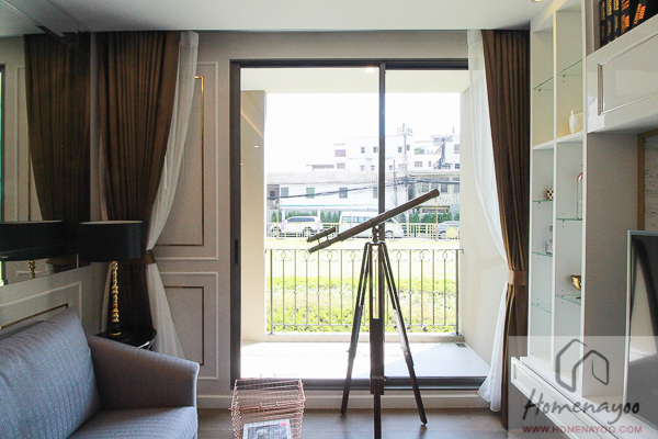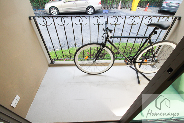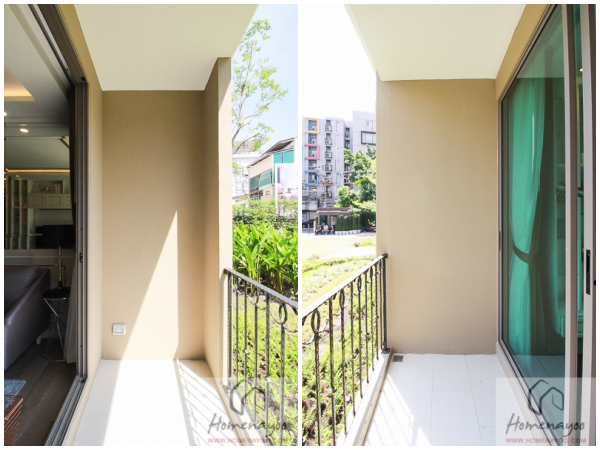 ขนาดระเบียงค่อนข้างกว้าง ประมาณ 1 x 2.5 เมตร สามารถตากผ้าได้ หรือใครอยากจะปลูกต้นไม้ก็สามารถหาไม้กระถางขนาดกลางมาวางได้ เพิ่มความเป็นธรรมชาติให้กับห้อง เวลามองออกมาตรงระเบียงแล้วจะได้ความสบายตาค่ะ