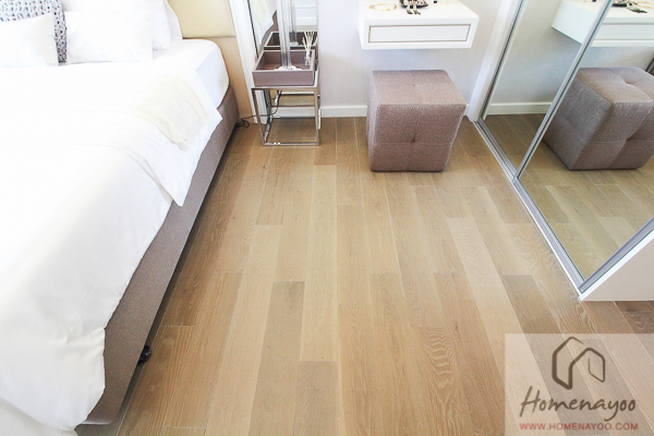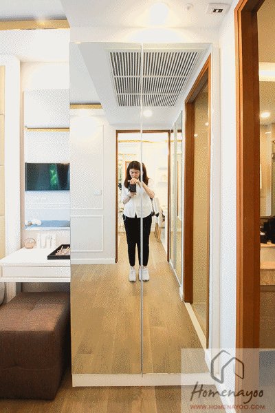 ส่วนกระจกทางซ้ายมือที่เราเห็นจะเป็นกระจกของห้องน้ำ โดยห้องน้ำในห้อง master bedroom นี้จะทำเป็นแบบซีทรูคือเป็นกระจกบานใหญ่เชื่อมพื้นที่ทั้งสองเข้าด้วยกันซึ่งถ้าใครคิดว่ากระจกแบบนี้เซ็กซี่เกินไปก็สามารถที่จะหามู่ลี่หรือติดสติ๊กเกอร์ฝ้าสำหรับติดกระจกได้ค่ะ