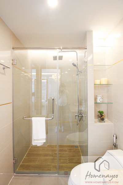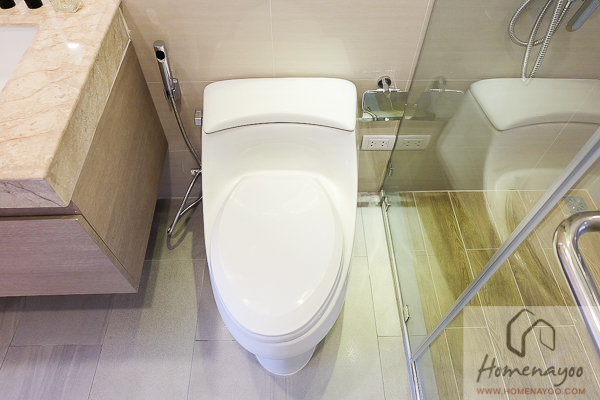 อีกด้านของห้องน้ำจะเป็นส่วนของโถสุขภัณฑ์และห้องอาบน้ำ โดยภายในห้องอาบน้ำจะติดตั้ง shower box มาให้เรียบร้อย ภายในห้องน้ำมีฝักบัวแบบ rain shower และ hand shower ติดตั้งมาให้เรียบร้อย ขนาดห้องอาบน้ำประมาณ 90 x 80 เซนติเมตร ถือว่าค่อนข้างกะทัดรัดไปหน่อย แต่เมื่อเฉลี่ยกับอ่างอาบน้ำที่ได้แล้วก็ถือว่าพอดีๆค่ะ
