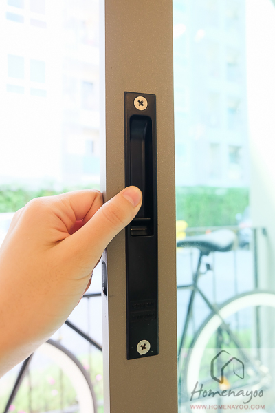 จากห้องครัวจะมีระเบียงภายนอกโดยประตูที่กั้นระหว่างพื้นที่ จะได้เป็นประตูบานเลื่อนคู่บานกรอบลูมิเนียม ผิว Sahara สี gray