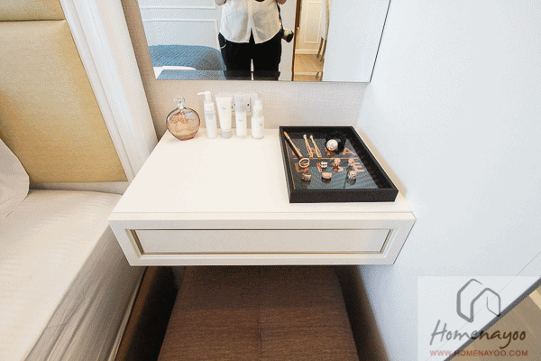 โต๊ะเครื่องแป้งได้เป็นโต๊ะแบบลอยตัว มีลิ้นชักพร้อมกระจกเงาและเก้าอี้บุนวม ส่วนตู้เสื้อผ้าจะได้เป็นตู้แบบ built in สีขาว