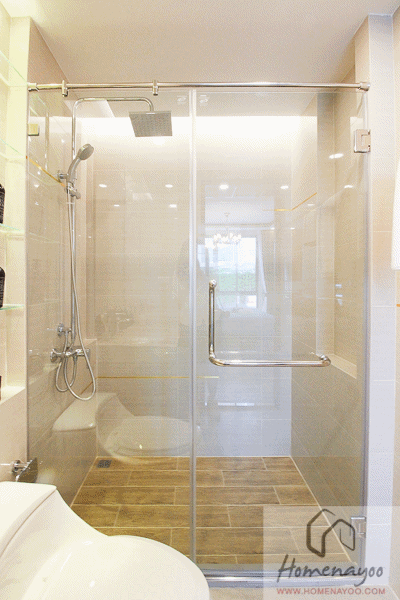 ห้องอาบน้ำจะได้ shower box ประตูบานเปิดแบบผลักเข้าในห้องน้ำ มือจับประตูสามารถวางแขวนผ้าเช็ดตัวได้