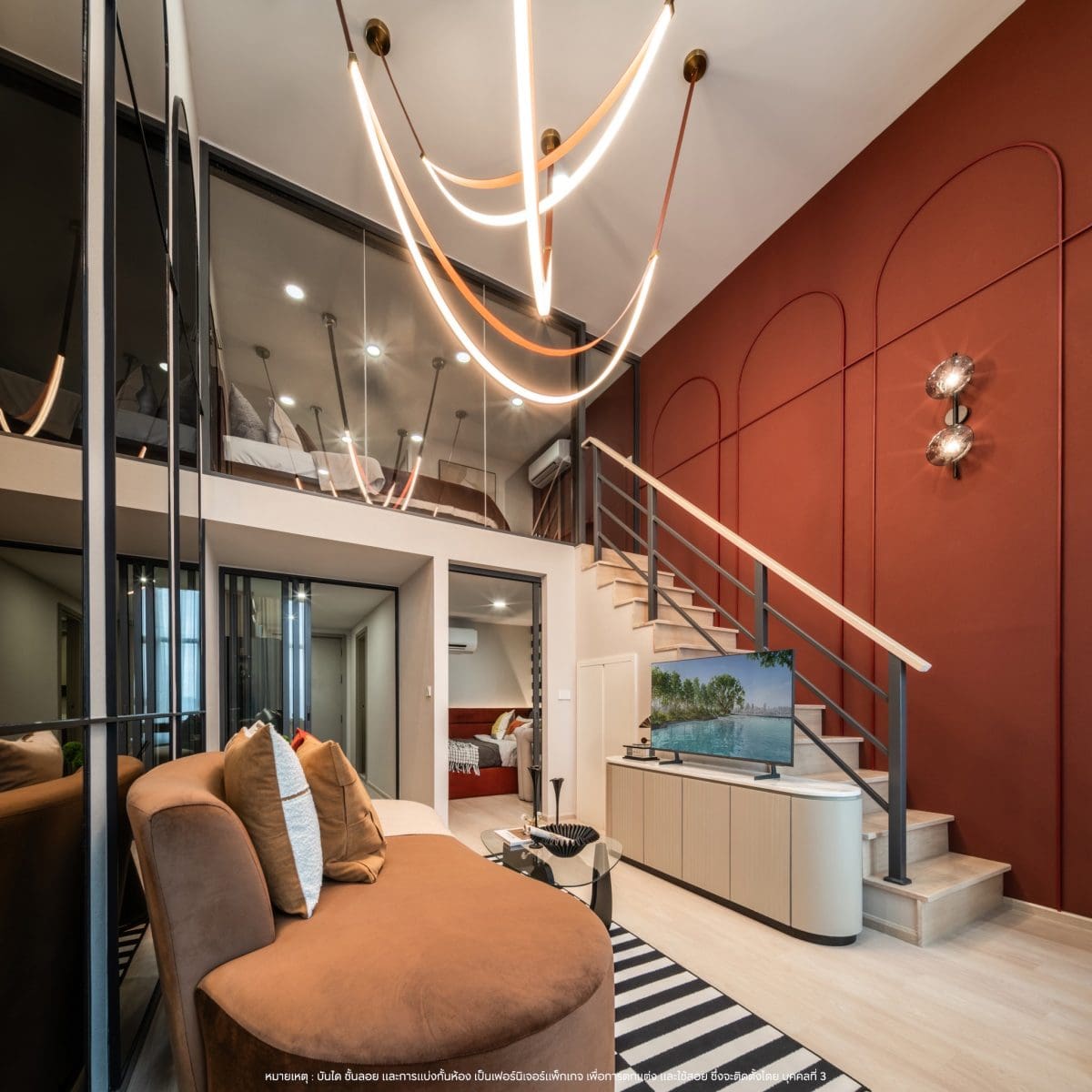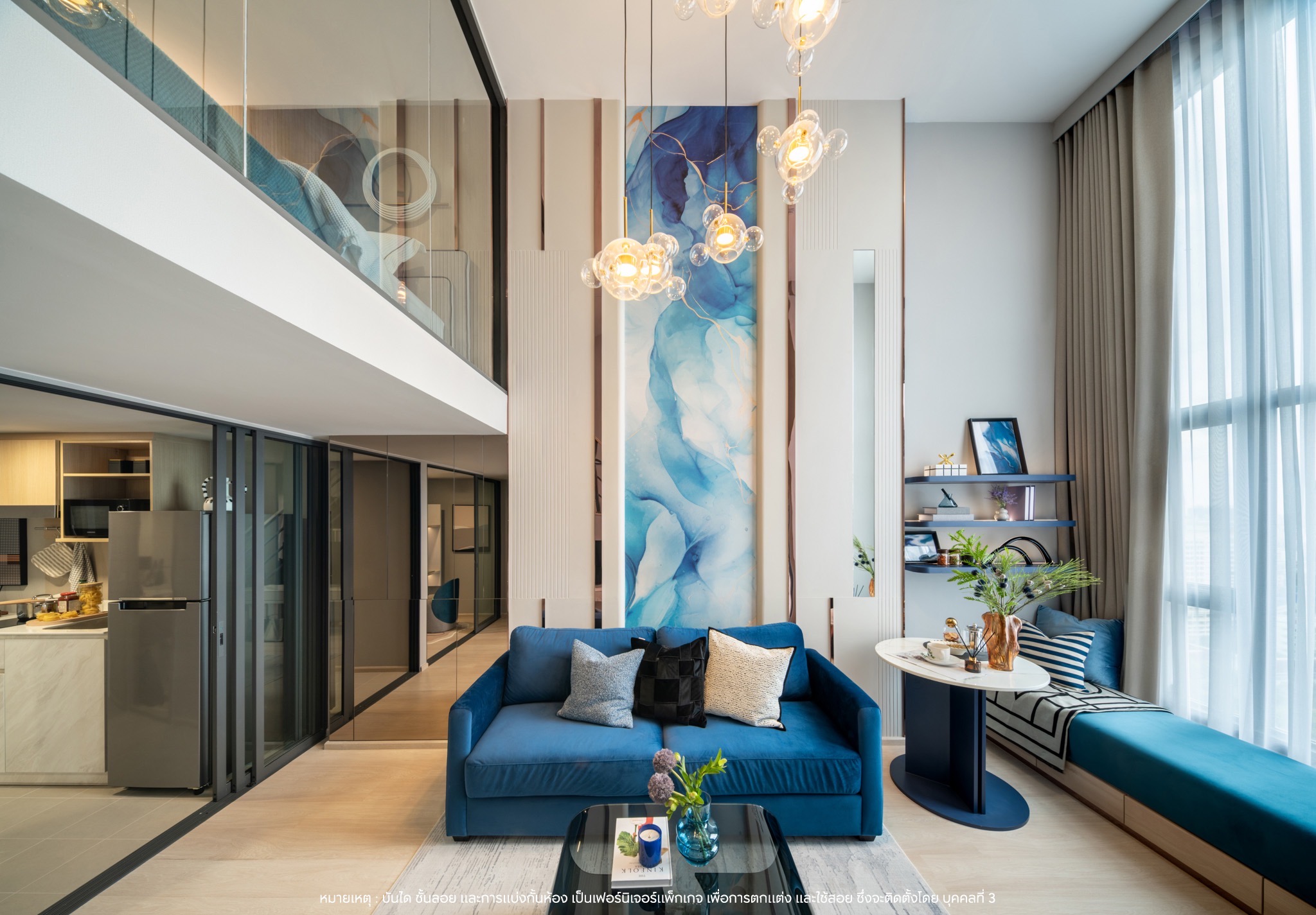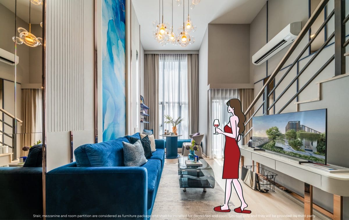 ห้องชุด VERTIPLEX 1 BEDROOM EXTRA ในราคาเริ่มต้น 4.89 ล้านบาท* โดดเด่นด้วยการดีไซน์พื้นที่ส่วน Living – Dining Area เพดานสูง พร้อมมุมมองที่เชื่อมต่อกับวิวภายนอกอย่างโปร่งโล่ง