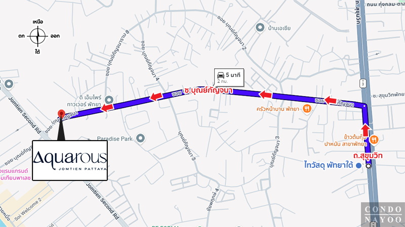 เริ่มจากถนนสุขุมวิท ⇒ แยกบุณย์กัญจนา ⇒ ซอยบุณย์กัญจนา ⇒ ถึงโครงการ Aquarous จอมเทียน พัทยา ทางฝั่งซ้ายมือ