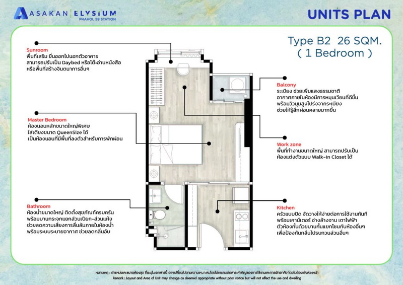 แปลนห้องพัก 1 Bedroom 26.00 ตร.ม.