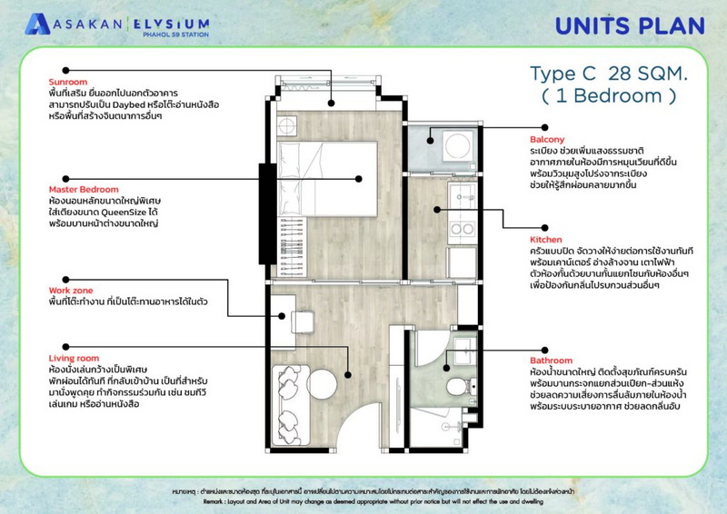 แปลนห้องพัก 1 Bedroom 28.00 ตร.ม.