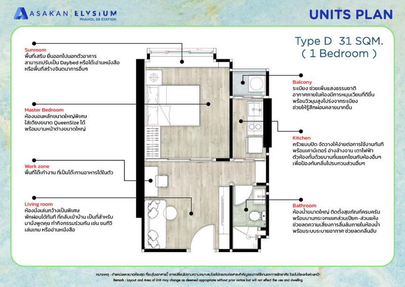 แปลนห้องพัก 1 Bedroom 31.00 ตร.ม.