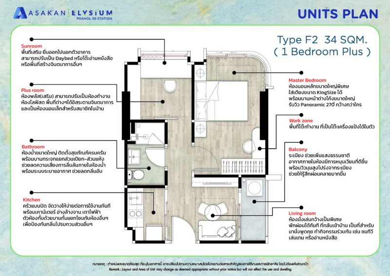 แปลนห้องพัก 1 Bedroom Plus 34.00 ตร.ม.