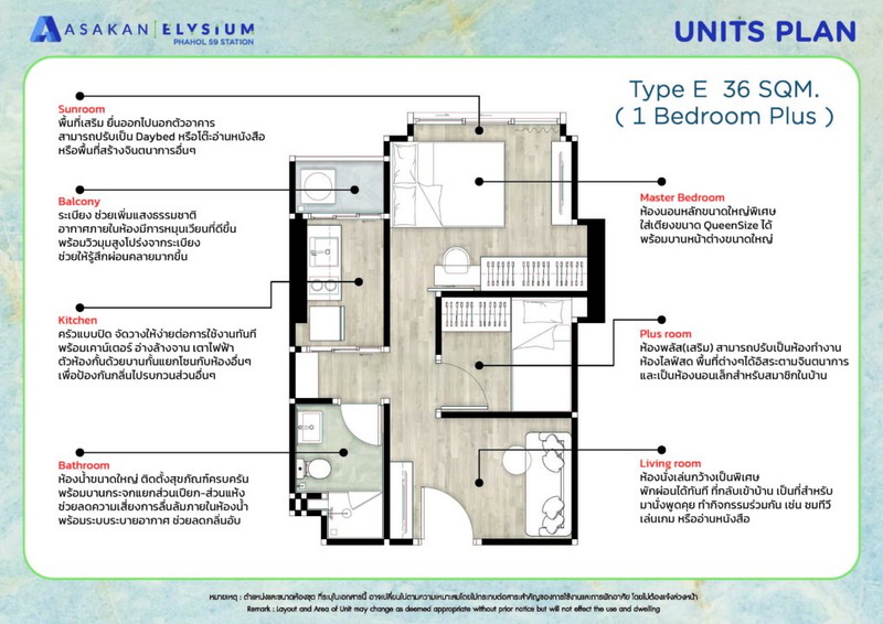 แปลนห้องพัก 1 Bedroom Plus 36.00 ตร.ม.