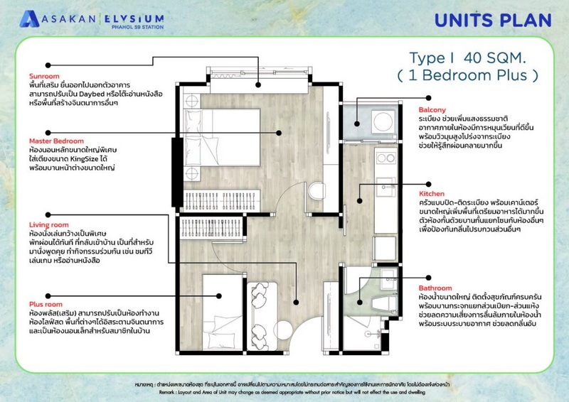 แปลนห้องพัก 1 Bedroom Plus 40.00 ตร.ม.
