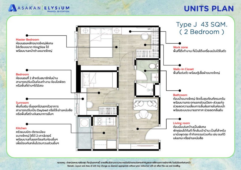 แปลนห้องพัก 2 Bedroom 43.00 ตร.ม.