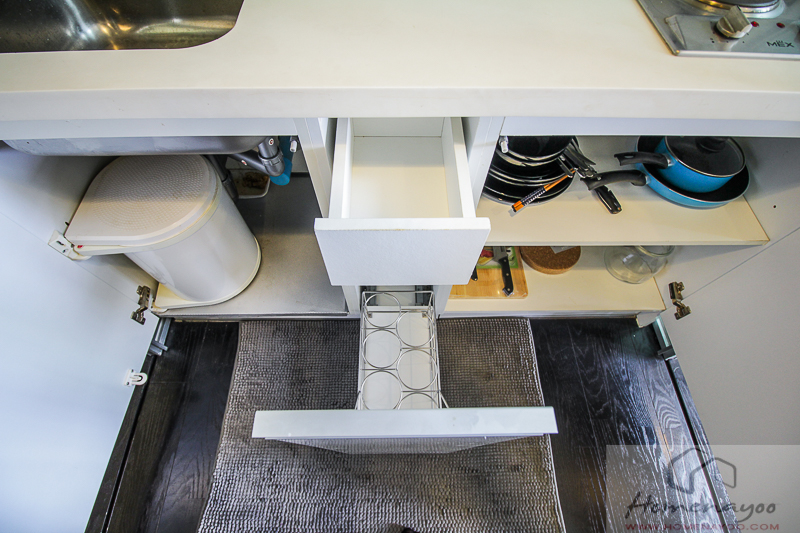 อีกฝั่งมีตู้บานเปิด 1 บานพร้อมถังขยะ และลิ้นชัก 1 ชั้น มีช่องวางไมโครเวฟ