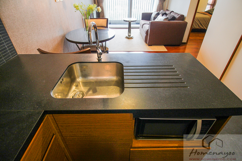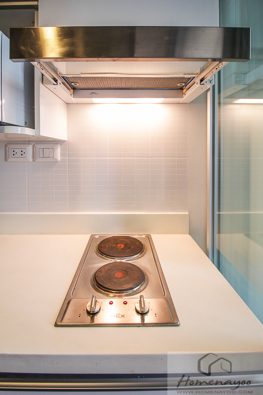 อีกฝั่งเป็นชุดเคาน์เตอร์ครัว ได้เคาน์เตอร์เป็นตัว L มีพื้นที่วางตู้เย็นซ้ายมือ