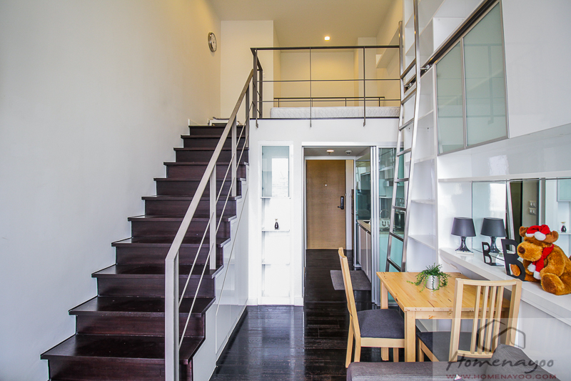 ขึ้นมาจะมีพื้นที่วางเตียงนอนขนาด 5 ฟุต ถ้าวาง 6 ฟุตก็จะเต็มพื้นที่พอดี มีราวกันตกสองฝั่งมองลงไปด้านล่างได้