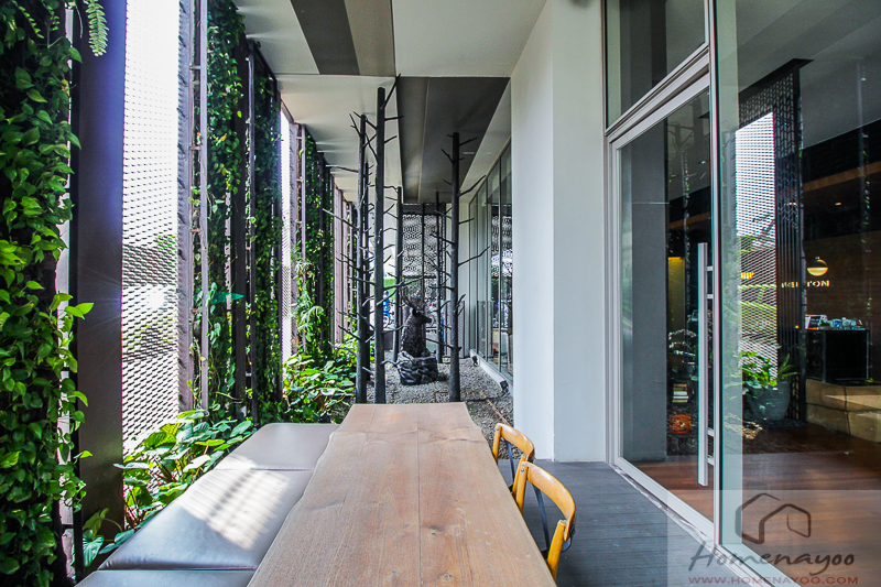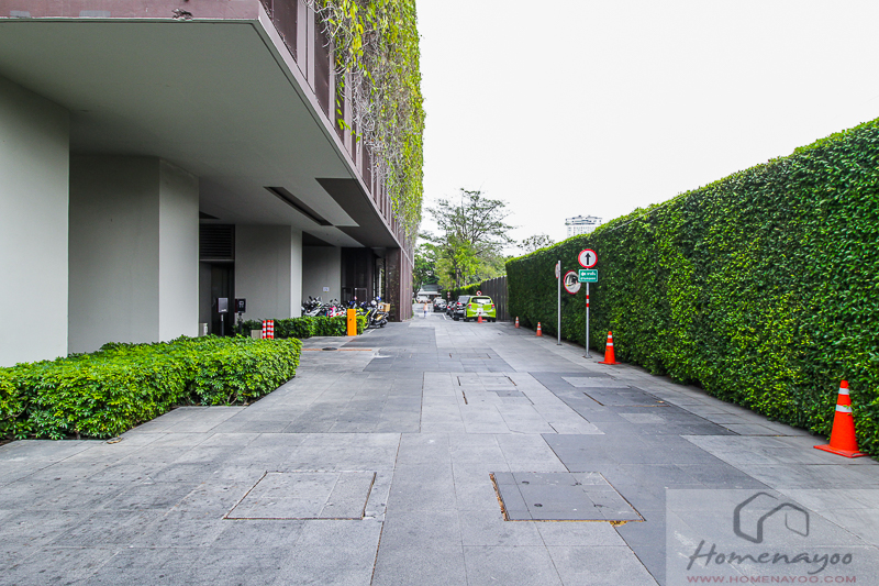 ด้านหน้าโครงการจะไม่มีรั้วกำแพงกั้นเหมือนโครงการทั่วไป แต่ตกแต่งเป็นแนวพุ่มไม้ และแนวต้นสน มีป้ายโครงการ Morph 38 ใครที่ผ่านไปมาแถวนี้ต้องสะดุดตาแน่นอนครับ