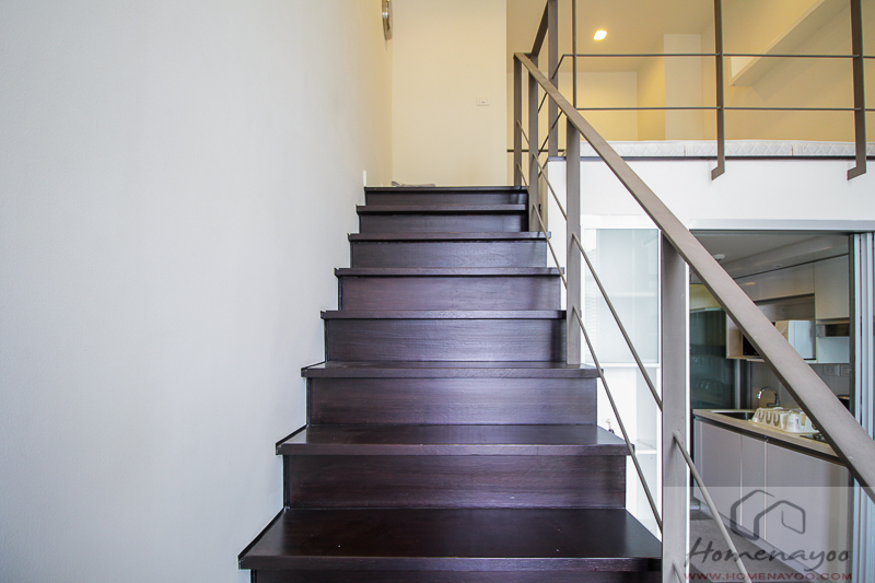 บันไดเป็นไม้จริงสีเข้ม มีราวบันไดเป็นเหล็กทำสีเทา