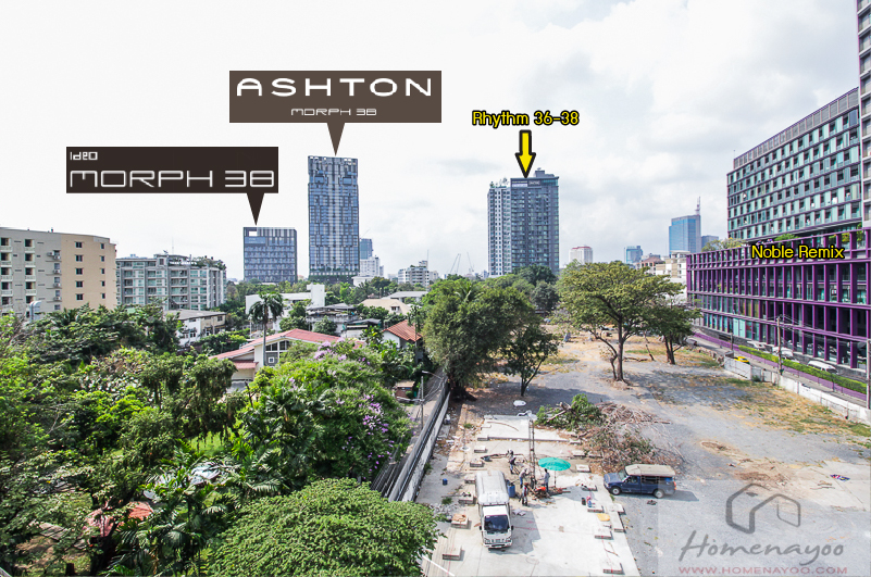 จากบนสถานีมองเข้าไปฝั่งสุขุมวิทเลขคู่จะเห็นโครงการ Ashton Morph 38 และ Ideo Morph 38 ฝั่งขวาเป็นโครงการ Rhythm 36-38