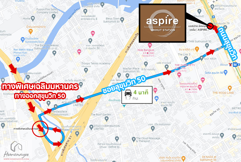 การเดินทางเริ่มจาก ทางพิเศษเฉลิมมหานคร ⇒ ทางออกซอยสุขุมวิท 50 ⇒ ถนนสุขุมวิท ⇒ ASPIRE Onnut Station *ห่างจาก BTS อ่อนนุช เพียง 200 เมตร