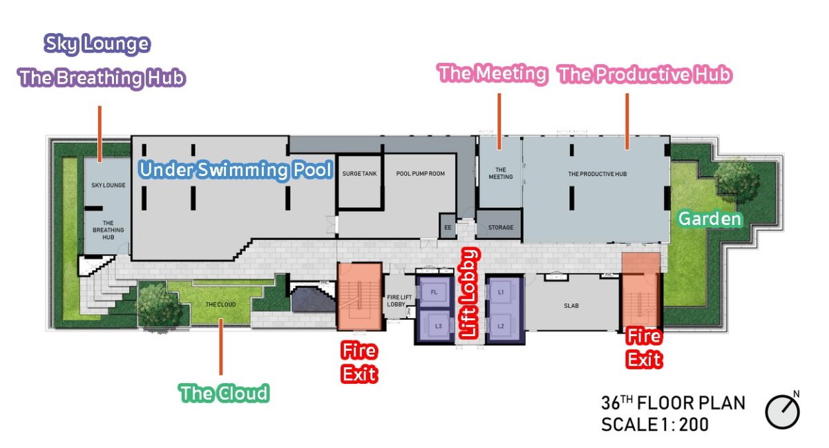 พร้อมดีไซน์สเปซฟังก์ชันตอบรับทุกมิติการใช้ชีวิต เช่น The Breathing Hub, The Productive Hub, The Workout Hub, The Aqua สระว่ายน้ำระบบน้ำเกลือพร้อมระบบ Jacuzzi และ The Gym ฟิตเนส 24 ชั่วโมง และ The Deck Garden สวนสีเขียวลอยฟ้าขนาดใหญ่ Rooftop Garden บนอาคารจอดรถ