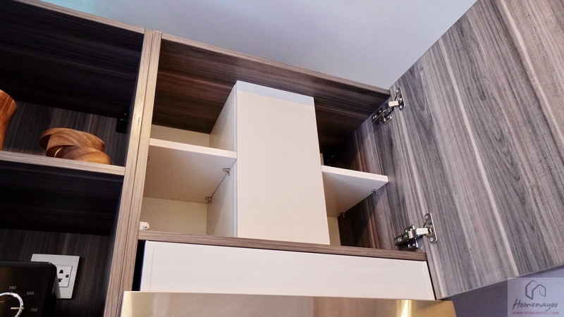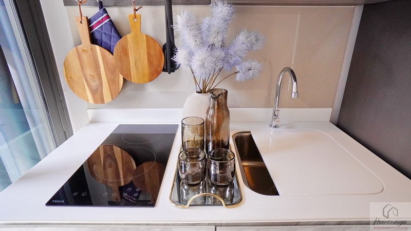 ชุดครัวที่ได้มากับห้อง จะเป็นชุดครัว Built-in ที่มาพร้อมตู้เก็บของบน-ล่างปิดผิวเมลามีนลายหินอ่อนและลายไม้ ส่วน Backsplash เป็นแกรนิตโต้สีเบจ พร้อมติดเต้าเสียบปลั๊กไฟมาให้ 1 จุด