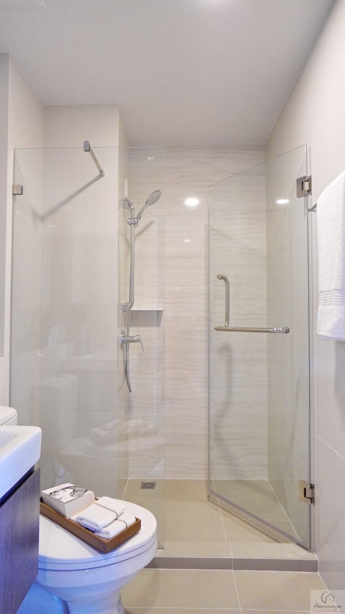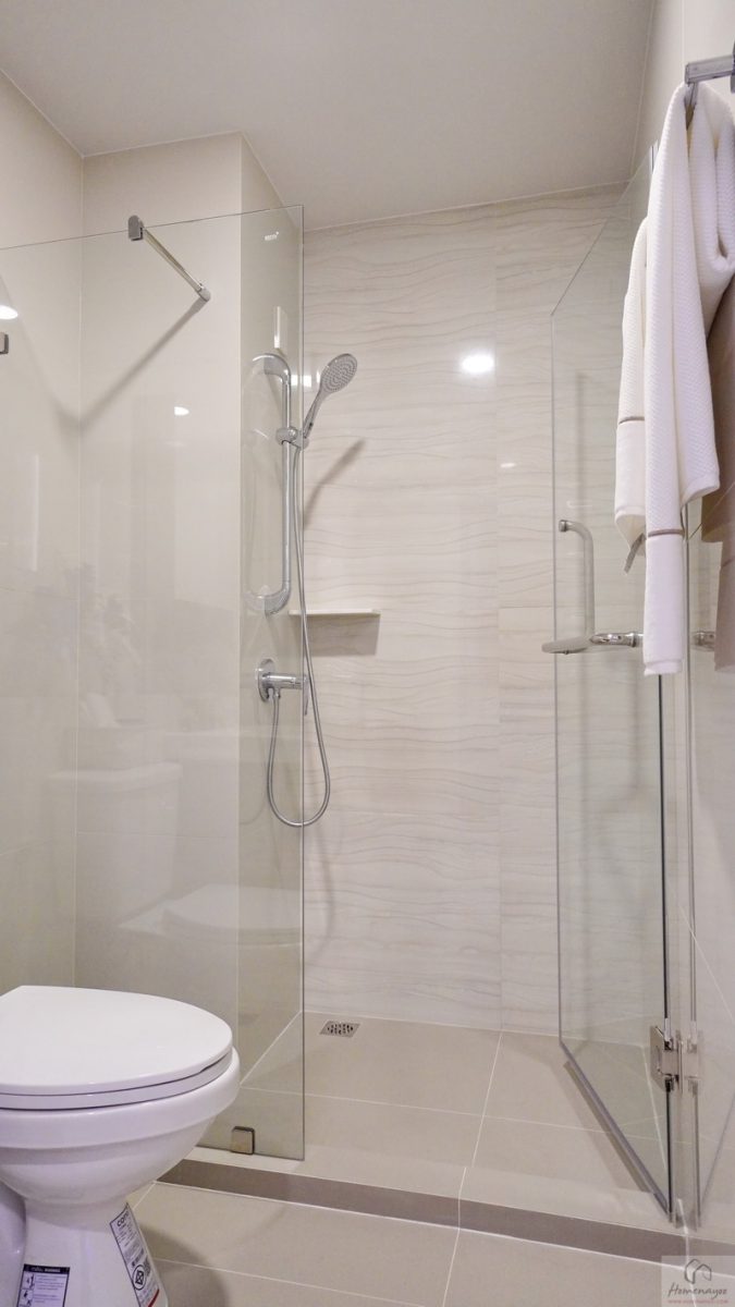 ภายในติดฝักบัว Hand Shower ก๊อกน้ำโครเมียมก้านโยก พร้อมราวปรับระดับสูง-ต่ำ ผนังขวามือติดชั้นวางของหินสังเคราะห์สีขาวให้ 1 ชิ้น ด้านบนเดินงานระบบติด Junction Box รองรับการติดเครื่องทำน้ำอุ่นมาให้เรียบร้อย