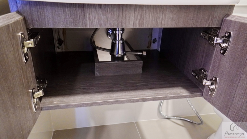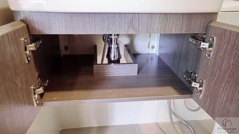 ตู้เก็บของใต้อ่างได้มาเหมือนห้องก่อนหน้านี้ เป็นตู้บานเปิดลายไม้ เก็บของใช้จุกจิกได้พอสมควร