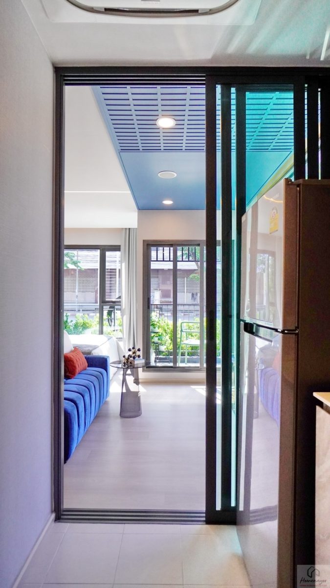 เปิดประตูเข้ามาภายในห้อง จะเจอกับโถงทางเดินเล็ก ๆ ตรงข้ามกันจะเป็นที่ตั้งของห้องน้ำ ผ่านจุดนี้เข้าไปจะเป็น Living Area กว้าง ๆ เชื่อมต่อกับห้องนอนและห้องครัวปิด ที่แยกโซนไว้อย่างเป็นสัดส่วน
