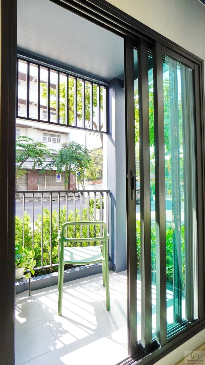 ระเบียงพักผ่อนจะกั้นแยกโซนด้วยประตูกระจกบานเลื่อน 3 ตอน กรอบอะลูมิเนียม Powder Coat สีเทาดำ พร้อมยกธรณี-วงกบสูงขึ้นมาให้ 15 ซม. เพื่อป้องกันความชื้น น้ำฝน และสิ่งสกปรกไม่ให้พัดเข้าสู่ห้องพักโดยตรงได้