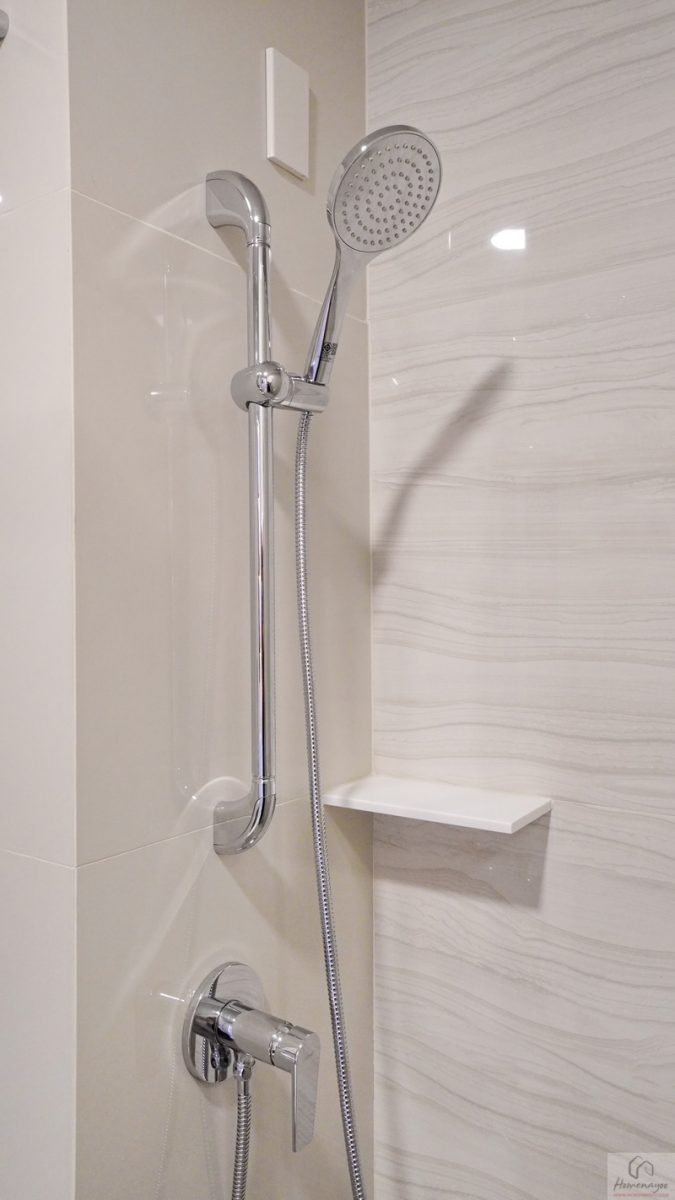 ภายในติดตั้งฝักบัว Hand Shower ก๊อกน้ำโครเมียมก้านโยก พร้อมราวปรับระดับสูง-ต่ำ ผนังขวามือติดชั้นวางของหินสังเคราะห์สีขาวให้ 1 ชิ้น ด้านบนเดินงานระบบติด Junction Box รองรับการติดเครื่องทำน้ำอุ่นมาให้เรียบร้อย ส่วนผนังซ้ายมือจะมีราวแขวนผ้าสแตนเลสติดมาให้อีก 1 ชิ้นค่ะ
