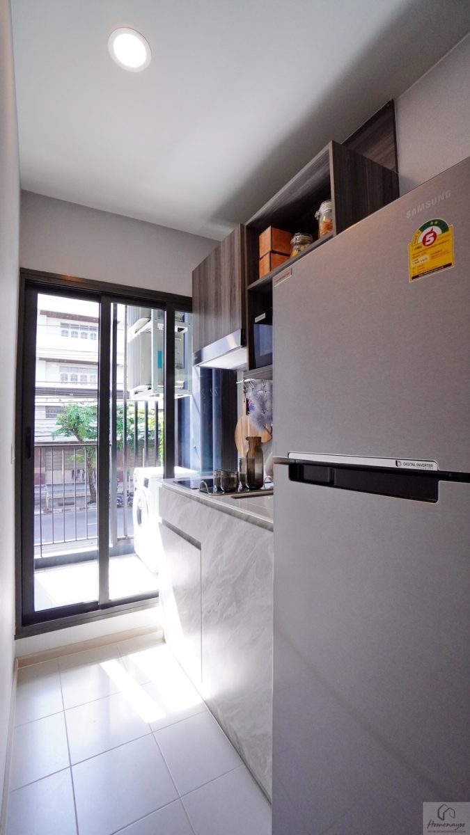ขวามือจะเป็นชุดครัว Built-in พร้อม Hob-Hood-Sink ที่ทางโครงการติดตั้งมาให้มาตรฐานกับตัวห้อง ถัดไปจะเป็นพื้นที่สำหรับวางตู้เย็น ที่รองรับตู้เย็น 2 ประตู ขนาด 8-10 คิว ได้กำลังพอดีค่ะ
