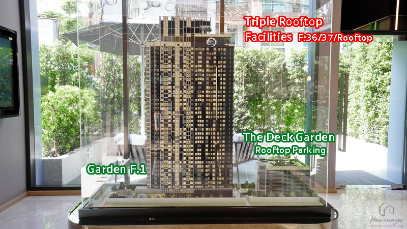 ต้อนรับเข้าสู่โครงการกับพื้นที่สวนสีเขียว ส่วน Lobby ชั้น 1 รวมถึง Triple Rooftop Facilities เชื่อมต่อตั้งแต่ชั้น 36-37-Rooftop ได้มุมมองการผ่อนคลายรับวิวโค้งน้ำบางกระเจ้า และวิวเมืองสุขุมวิทแบบ 180 องศา