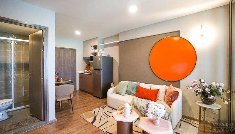 เดินเข้าห้องมาส่วนแรกจะเป็นส่วนครัวได้เป็นครัวเปิด ตรงข้ามเคาน์เตอร์ครัวจะเป็นส่วนรับประทานอาหาร ติดกับครัวจะเป็นห้องน้ำภายในแบ่งส่วนเปียกส่วนแห้ง ถัดไปจะเป็นส่วนห้องนั่งเล่น ด้านในสุดจะเป็นห้องนอนมีกระจกบานเลื่อนเปิดปิดแยกส่วนได้ ภายในห้องนอนมีพื้นที่มาให้เยอะวางเตียง 5-6 ฟุตได้ ริมหน้าต่างมีพื้นที่ให้ทำเป็นมุมวางโต๊ะทำงานได้ ฝั่งปลายเตียงมีพื้นที่ให้วางตู้เสื้อผ้าได้อีก ถัดไปเป็นระเบียงอยู่ติดกับห้องนอน