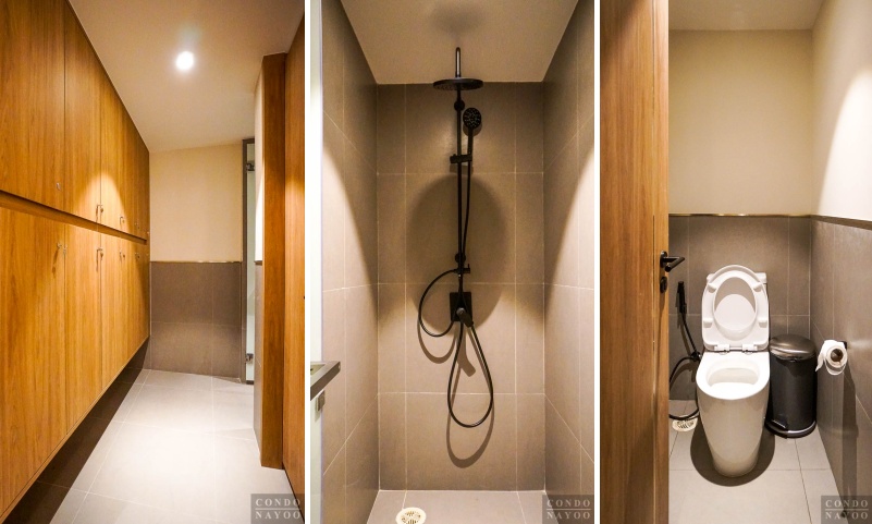 ภายในห้องน้ำแบ่งส่วนเปียกส่วนแห้ง พื้นและผนังตกแต่งด้วยกระเบื้องเซรามิกโทนสีเทา ส่วนระบบระบายอากาศจะติดตั้งพัดลมดูดอากาศมาให้ 1 ตัว เพื่อให้อากาศไหลเวียนได้ดี