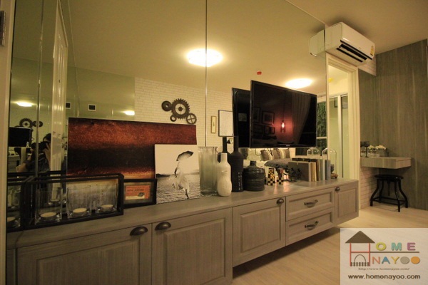 ตรงข้ามบิวท์อินเป็นตู้เก็บของ ทีวีแขวนติดผนัง >> ผนังห้องตกแต่งด้วยกระเงา ทำให้ห้องขนาด 28.00 ตร.ม. ดูกว้างขึ้นมากค่ะ ใครจะเอาไปเป็นไอเดียก็ไม่ว่ากันนะ
