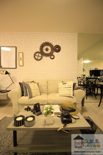 ถัดเข้ามา วางโซฟาขนาด 2 ที่นั่ง พร้อมโต๊ะกลางขนาดกะทัดรัด