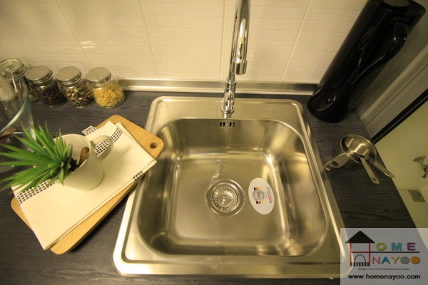 ซิงค์ล้างจานหลุมเดี่ยว ผนังด้านหลังปูกระเบื้องให้ แต่ที่เคาน์เตอร์ครัว ไม่มีเตา + เครื่องดูดควันให้นะค่ะ