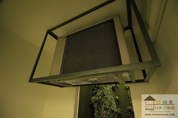 คอมเพรสเซอร์แขวนไว้ด้านบน ไม่มีระแนงกั้น เปลือยเปล่าๆ แบบที่เห็นเลย