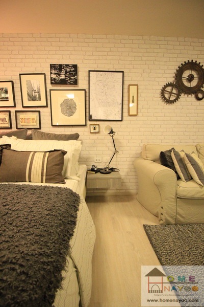 ข้างเตียงติดกับโซฟา บิวท์อินเป็นโต๊ะข้างเตียงไว้ด้วยค่ะ