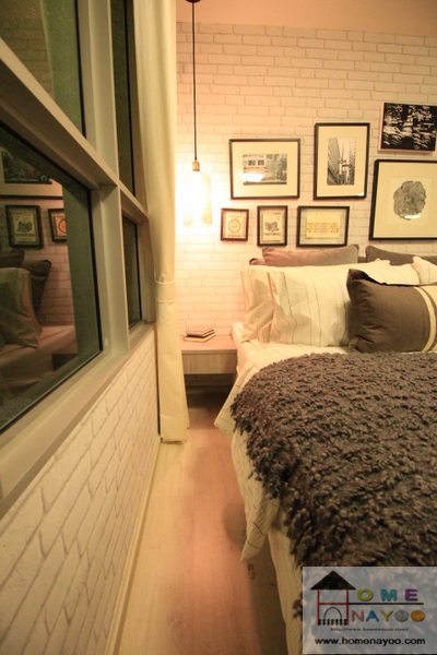 ถัดจากส่วน Living ไปก็จะเป็นเตียงนอน มีหน้าต่างกระจกใส ช่วยรับแสงให้มา 1 จุด > ด้านซ้ายมือที่เห็นเป็นทางเข้า จะเป็นส่วนของห้องน้ำ และห้องครัวพร้อมระเบียงค่ะ