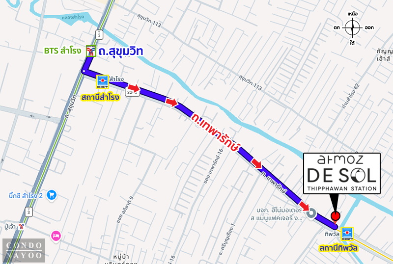 ถนนสุขุมวิท ⇒ แยกเทพารักษ์ ⇒ ถนนเทพารักษ์ ⇒ ประมาณ 1.7 กม.* ถึงโครงการ Atmoz De Sol Thipphawan Station ทางฝั่งซ้ายมือ ติดกับ MRT ทิพวัล