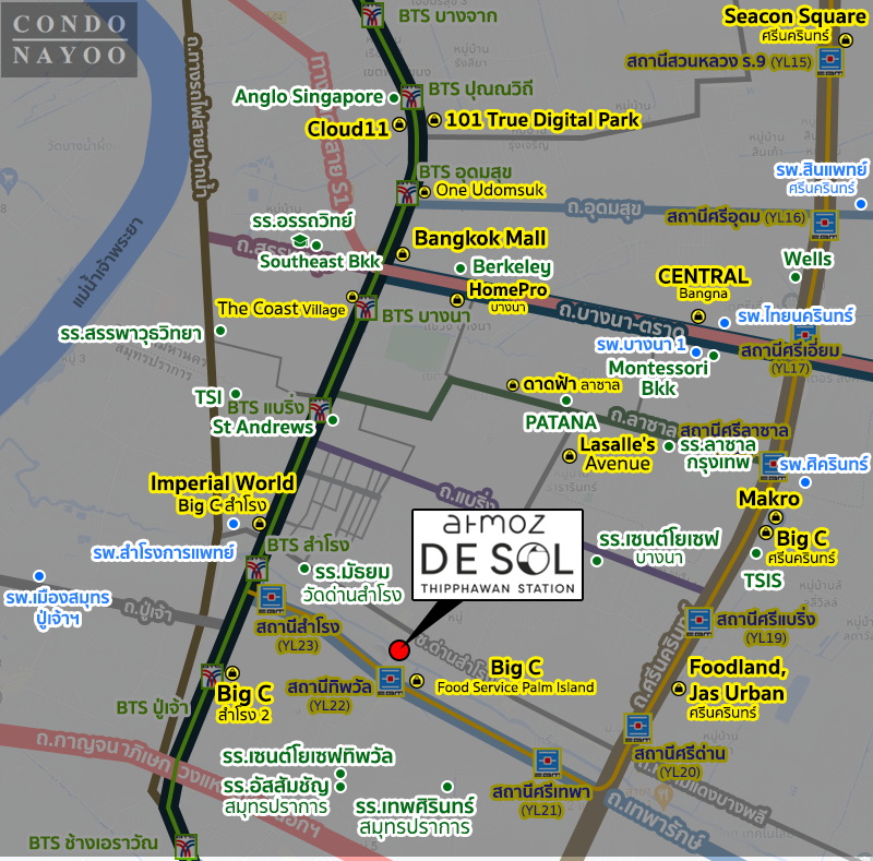 Atmoz De Sol Thipphawan Station คอนโดโครงการใหม่ จาก AssetWise ที่ตั้งโครงการอยู่บนทำเลศักยภาพติดถนนเทพารักษ์ ใกล้รถไฟฟ้าสายสีเหลือง สถานีทิพวัล เพียง 0 ม.* และเพียง 1 สถานี ถึง BTS สำโรง