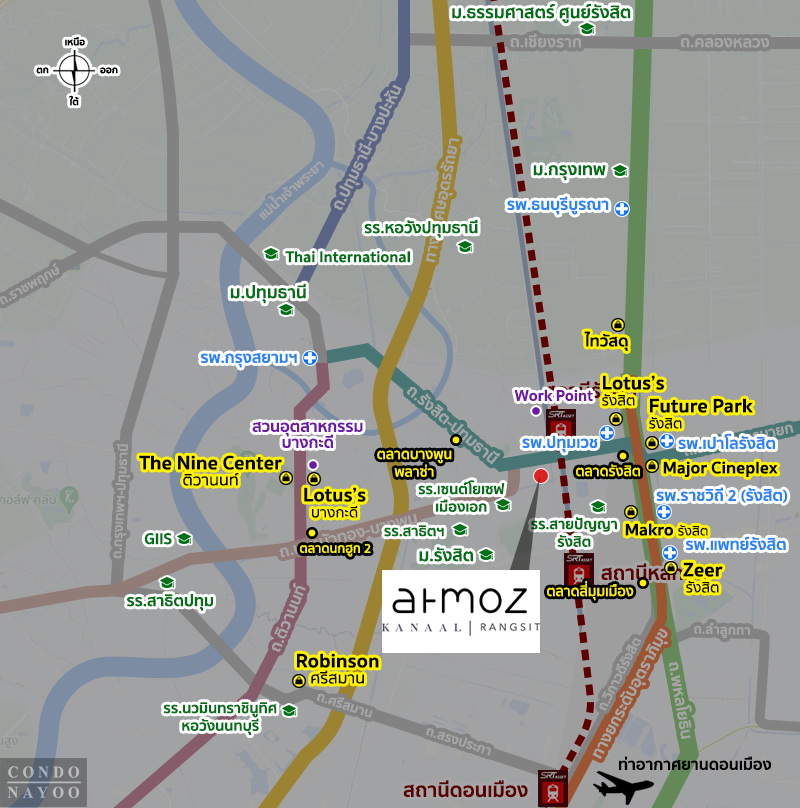 Atmoz Kanaal รังสิต คอนโดใหม่ บรรยากาศริมน้ำ ใจกลางรังสิต โครงการจาก AssetWise ทำเลดี ติดถนนใหญ่ เดินทางสะดวก เชื่อมต่อใจกลางเมือง ด้วยทางด่วน และ โทลล์เวย์ เพียง 3 นาที* ถึง SRT สถานีรังสิต ใกล้ไลฟ์สไตล์มอลล์ ตอบโจทย์การใช้ชีวิตทุกด้าน พร้อมบริการ Shuttle Service
