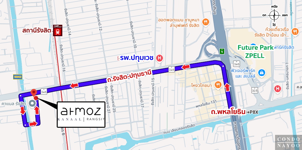 ถนนพหลโยธิน ⇒ ถนนรังสิต-ปทุมธานี ⇒ ซอยรังสิต-ปทุมธานี 33 ⇒ ถึงโครงการ Atmoz Kanaal รังสิต ทางฝั่งซ้ายมือ
