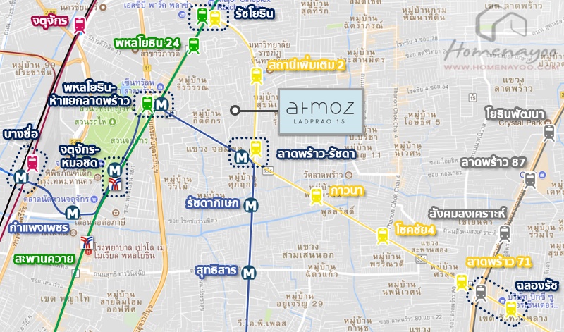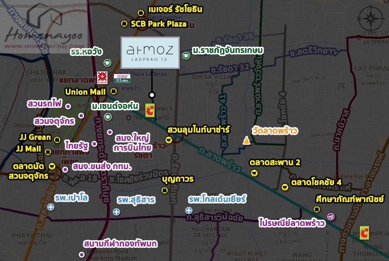 ทำเลที่ตั้ง โครงการ Atmoz ลาดพร้าว 15 ตั้งอยู่ในซอยลาดพร้าว 15 แยก 1-10 ห่างจากถนนลาดพร้าว 800 เมตร ในช่วงลาดพร้าวตอนบน ซึ่งอยู่ห่างจาก MRT สถานีลาดพร้าวเพียง 1 กม. เท่านั้นค่ะ ภายในซอยเป็นแหล่งของบ้านพักอาศัยหลังใหญ่ๆ ดั้งเดิมในย่านนี้ เงียบสงบและบรรยากาศดีทีเดียว พอออกมาที่ถนนใหญ่ลาดพร้าวจะเป็นเส้นที่มีความเจริญและความอุดมสมบูรณ์สูงมาก ทั้ง 2 ฝั่งถนนจะมีทั้งออฟฟิศ, อาคารพาณิชย์, ธนาคาร, อพาร์ทเม้นท์, คอนโดมิเนียมทั้ง High rise และ Low rise และบ้านพักอาศัย ซึ่งซอยลาดพร้าว 15 เอง ก็มีซอยทางลัดที่สามารถทะลุออก Big C ลาดพร้าวได้ในระยะที่เดินถึง